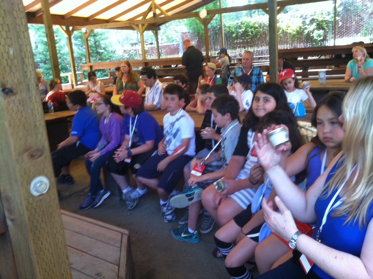 Kadima students with a WWII Veteran - Ed - who has a Purple Heart Medal |